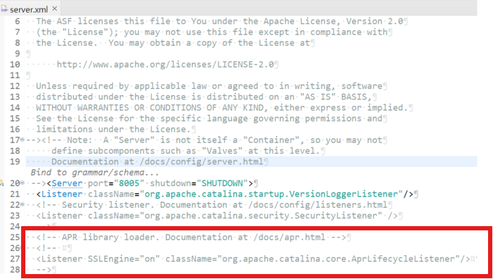 <Listener SSLEngine="on" className="org.apache.catalina.core.AprLifecycleListener"/>