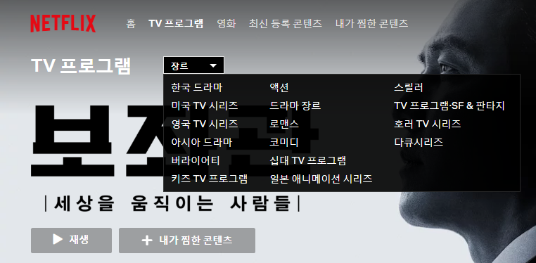 넷플릭스에서 장르별 선택은 하기와 같이 PC버전에서 상단에 "TV프로그램", "영화"를 선택 후 하단 화면중 장르에서 선택하면 된다.